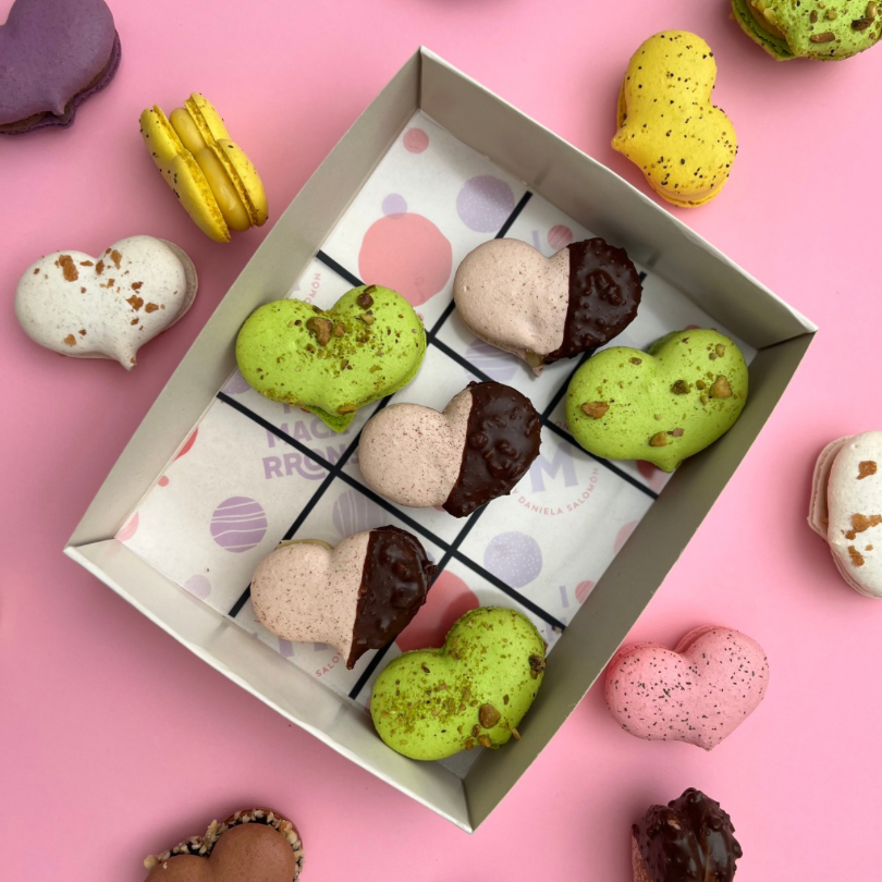 Esta no es solo una caja de macarons, hemos diseñado el empaque perfecto que se transforma en un tablero de Triqui, para que desafíes a tu persona favorita en el duelo más dulce de San Valentín.